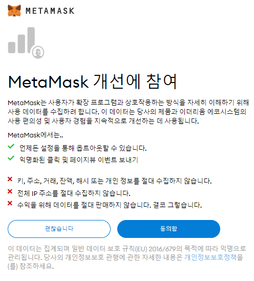 지갑 생성 버튼을 클릭하면, Meta Mask 개선활동에 참여할 것인지 문의를 하는데, 필수가 아니므로 꼭 참여 하지 않으셔도 됩니다.
