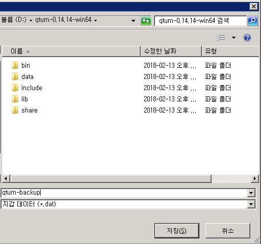 지갑을 백업받을 파일위치와 파일명을 지정 합니다. 확장자는 dat 파일이 만들어 집니다.