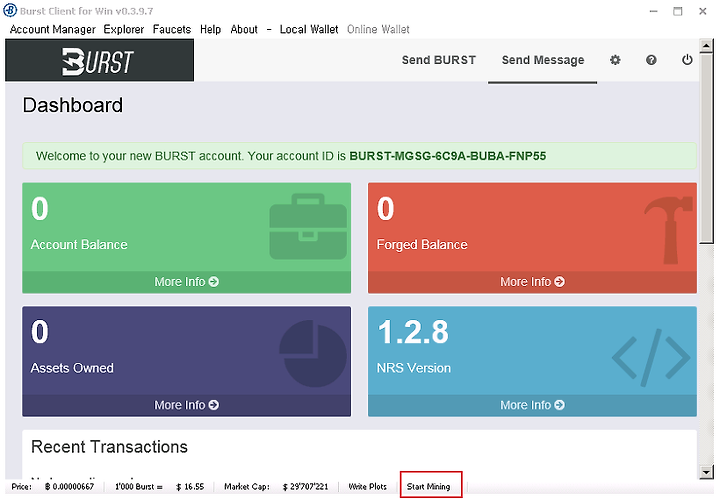 채굴을 시작 하려면, 반드시 블럭체인을 다 받은 이후에 해야 합니다. Burst Client 하단에, Start Mining 버튼을 클릭 해야 합니다.