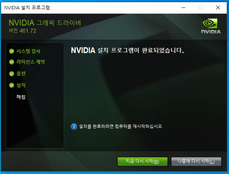 재시작을 해야, 새로운 드라이버를 사용할 수 있기 때문에, 재시작 해드립니다.