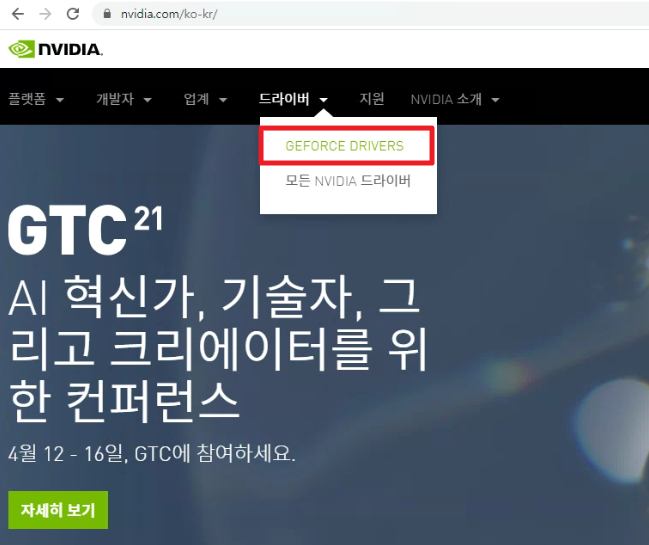 우선 Nvidia 홈페이지로 이동을 해야 겠죠? nvidia.com을 입력했는데, nvidia.com/ko-kr/ 한국어 버저으로 이동을 합니다. 상단 메뉴중에서 제가 테스트 하려는 그래픽 카드인 GEFORCE DRIVERS메뉴를 클릭 합니다.