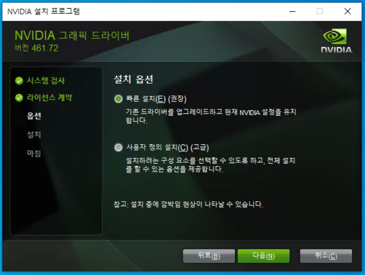 빠르게 진행하기 위해, 설치 옵션도 빠른 설치를 선택 하고 다음 버튼을 클릭 합니다.