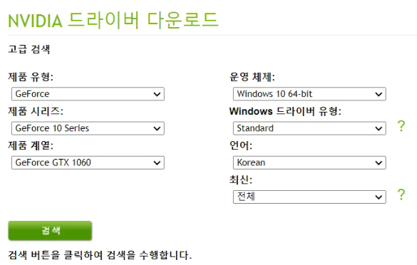 페이지가 드라이버 검색 페이지로 이동을 합니다. 제가 이번에 테스트 하는 그래픽카드는 GTX 1060 모델 이어서