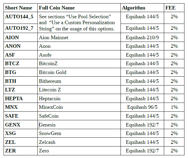 제일 먼저 확인해야 할 사항은 지원코인의 단축 명령어와 devfee 입니다. 대체로 2% 수준 입니다.