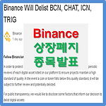 바이낸스(Binance) 거래소에서 상장폐지 종목에 대한 발표가 어제(10월9일) 있었습니다. 바이낸스가 상장폐지 종목을 발표하는 것은 CENTRA코인의 상장폐지를 발표한 이후에 거의 6개월만에 일어난 사건 입니다. 왜 상장폐지가 되었는지에 대해서는 구체적인 이유는 없지만, 상장을 폐지하게 되는 사유를 두루뭉실 하게 열거하여 4종목에 대한 상장폐지를 발표 하였습니다. 바이낸스 10월9일 상장폐지 종목BCN : BytecoinCHAT : ChatCoinICN : ICONOMITRIG : Triiggers 바이낸스 상장 폐지 사유Commitment of team to projectQuality and level of development activityNetwork / smart contract stabil..